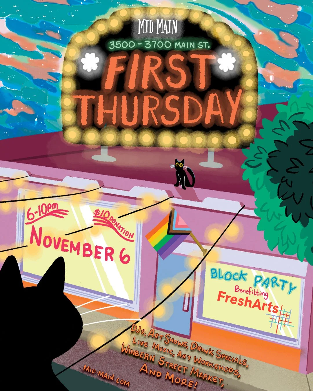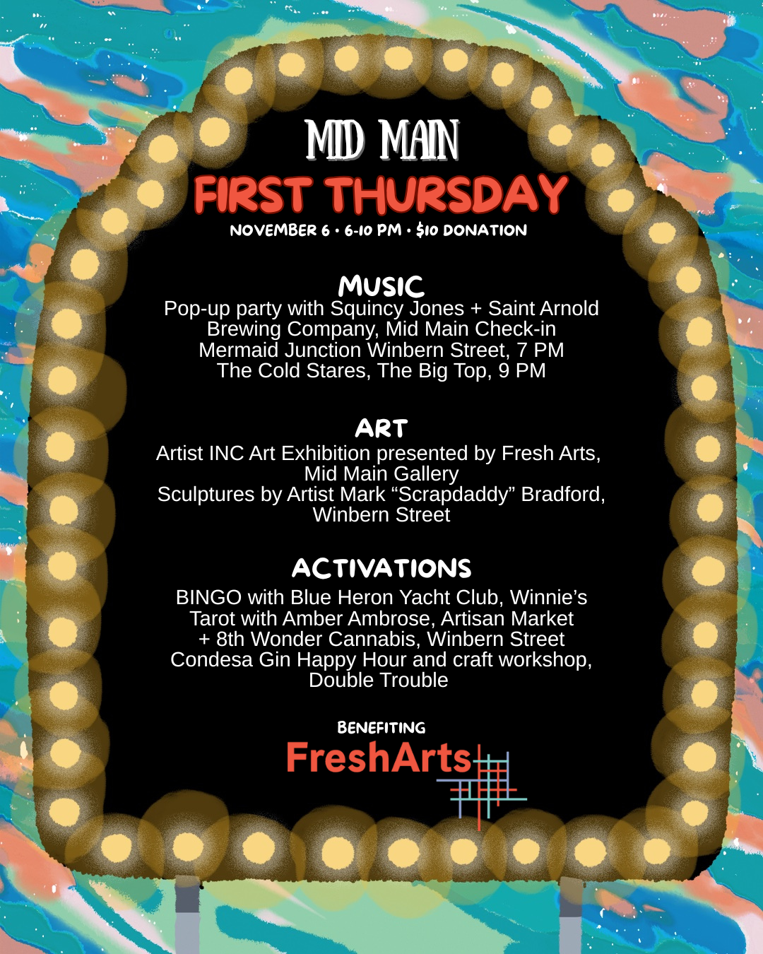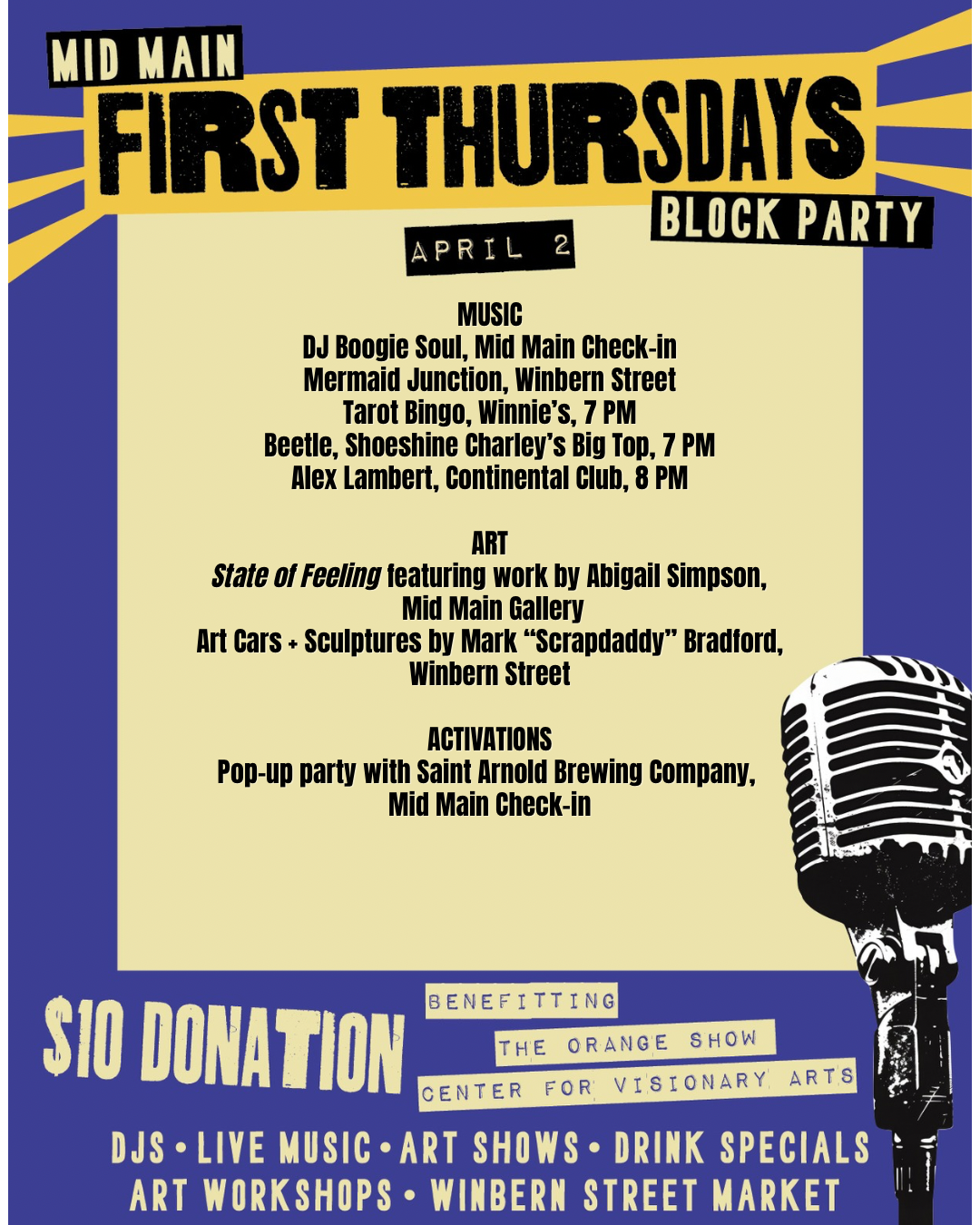 Come by the Mid Main Breezeway from 6-10pm, make a $10 donation to the featured organization and enjoy good music, great art, wonderful people PLUS tasty libations compliments of Saint Arnold Brewing Company. Special thanks to our amazing partners Mid Main Lofts, Big Kats, Ensemble Theatre, Sig's Lagoon, My Flaming Heart, Tacos A Go-Go, Winnie’s, Double Trouble, The Continental Club, Shoeshine Charley's Big Top, Eye Theory, Urbn Dental, Kura Sushi, Home Slice Pizza, Spicy Girl, Winnie’s.